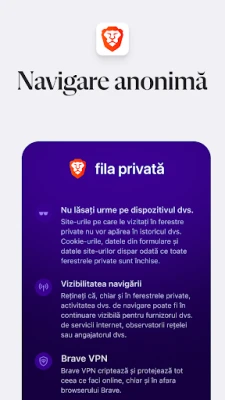 Fiecare aspect al **Browserului Web Brave** este gândit pentru a vă oferi control total și o experiență fluidă. De la filele private care nu lasă urme, la istoricul gestionabil și opțiunile de căutare rapidă, totul contribuie la o navigare fără întreruperi. Misiunea **Brave** este de a reconstrui un ecosistem digital echitabil, unde utilizatorii se bucură de viteză și securitate, iar creatorii de conținut sunt sprijiniți. Alăturați-vă viziunii pentru un web mai luminos, liber de distrageri și plin de posibilități, beneficiind de un motor de căutare rapid și de funcții avansate de securitate.
