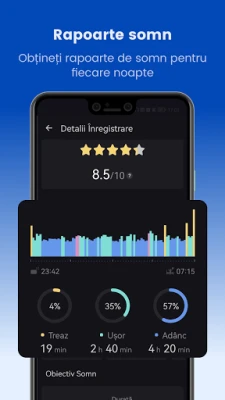 Descoperă o lume întreagă de informații despre somnul tău cu Sleep Monitor. Prin rapoarte personalizate, care îți prezintă evoluția săptămânală și lunară, vei identifica cu ușurință tiparele și vei putea ajusta comportamentele pentru o odihnă superioară. Ești curios ce se întâmplă după ce adormi? Funcția de înregistrare audio captează sforăitul, discuțiile din vis sau chiar scrâșnitul dinților, oferindu-ți o perspectivă adesea surprinzătoare și amuzantă asupra nopților tale. În plus, poți marca factori precum consumul de băuturi, exercițiile fizice sau stările emoționale anterioare somnului, pentru a înțelege impactul direct al acestora asupra calității repausului. Aplicația folosește inteligent senzorii telefonului tău pentru a detecta mișcările și variațiile de sunet, cartografiind cu precizie ciclurile de somn, de la etapele ușoare la cele de somn profund și REM.